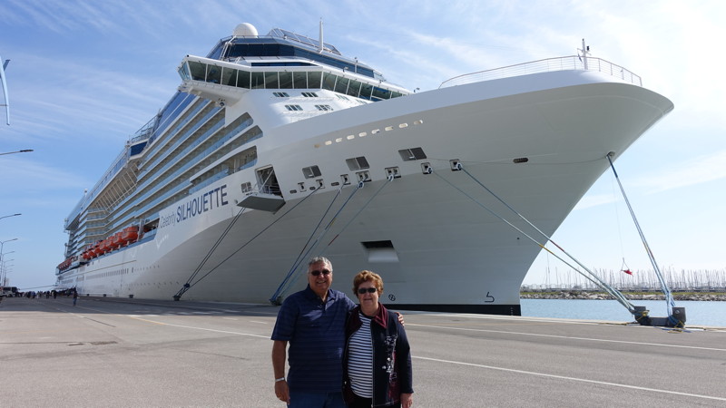 Après notre arrivée en avion à Venise, via une escale à Frankfurt, nous montons sur le Celebrity Silhouette, notre paquebot de croisière, au moment où un coucher de soleil absolument splendide fait rêver et baigne la mer.